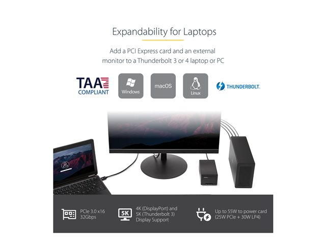 Ce châssis d'extension PCIe Thunderbolt 3 permet d'ajouter une carte PCI Express à votre ordinateur portable ou ordinateur de bureau, par le biais d'une connexion Thunderbolt 3 externe. Le châssis dispose également d'une sortie vidéo DisplayPort qui vous permet de connecter un écran supplémentaire à votre ordinateur portable, et prend en charge l'installation en série Thunderbolt 3 pour élargir encore davantage votre poste de travail.