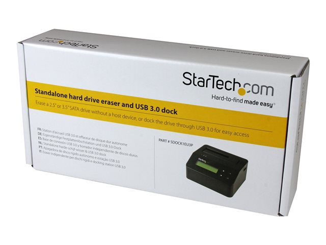 Tirez le meilleur parti de vos disques SATA. Cette station d'effacement autonome vous permet d'effacer vos SSD ou disques durs 2,5" et 3,5" sans aucune connexion à un ordinateur hôte, facilitant ainsi la réutilisation et la réaffectation de vos disques SATA. Pour assurer votre tranquillité d'esprit, la station propose une confirmation imprimée lorsque les données ont été effacées de manière sécurisée. La station d'effacement constitue par ailleurs une station d'accueil à baie unique pour un disque SATA et assure des performances de niveau USB 3.0, également appelé " USB 3.1 Gen 1 " (5 Gb/s).